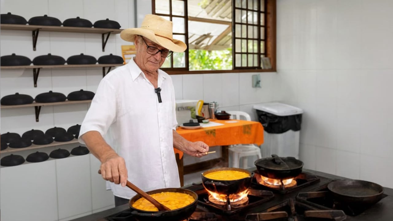 No sentido horário, do topo de cima, à esquerda, os sabores variados do Restaurante do Bira, que está situado em uma casa na árvore em uma floresta tropical: Moqueca Mista, um prato de frutos do mar; Pasteis cheios de queijo, camarão ou carne de siri. É o aperitivo favorito, raramente servido sem limões suculentos, uma batida "smash", um coquetel feito com "pinga", uma cachaça derivado da cana de açúcar.
